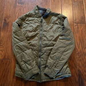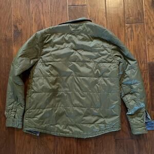 Lightweight military green Prana zip front puffer jacket. Very light but warm, has green blue soft interior. Too small for me but I’m great condition. Fits like a Mens medium.