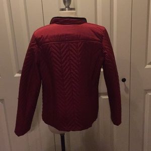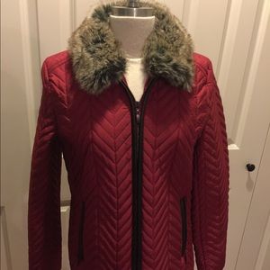 Beautiful cranberry color. Removable faux fur collar. Leather look trim. Zippered pockets.