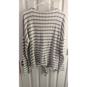 Gray and white striped pullover with tortoise shell buttons. Lightweight with knotted tie front. Gently used.