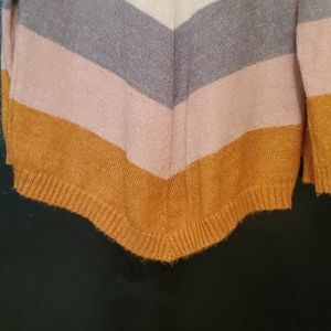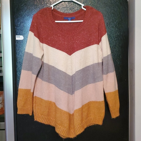 This sweater is a little asymmetrical at the bottom and looks great with a pair of leggings and booties. Worn a handful of times and now its too big! Size Large. Would fit an XL.