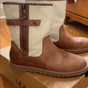 Chestnut leather and a cream colored canvas material. Worn a handful of times, but not perfect condition. The leather has a few scraps here and there. Ugg fur only under the base of the foot, therefore a light weight ugg that can be worn 3/4 seasons of the year!