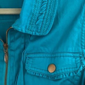Lots of cute details on this turquoise vest; ruching around the collar, thin ruffle edge around pockets and ruffle elastic at bottom. Zips up the front