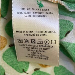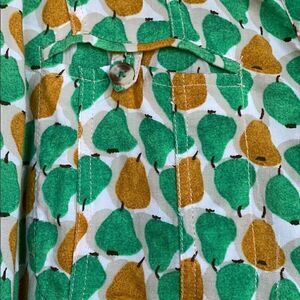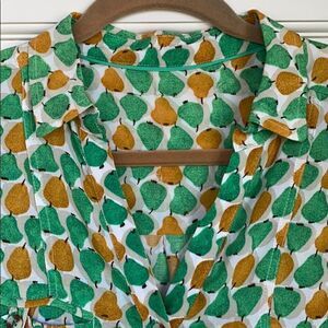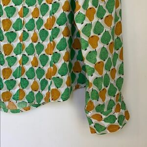 Lightweight Cotton Button Front Shirt From Anthropologie, Women’s Size Small, Fun Green And Gold Pesr Print, 2 Hidden Front Pockets, Excellent Used Condition