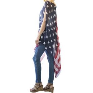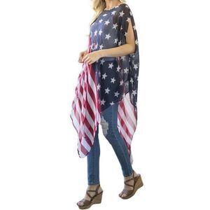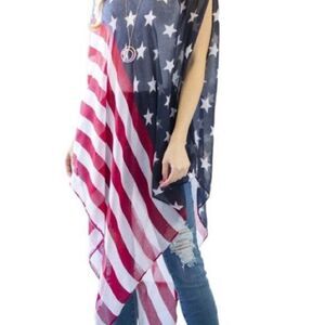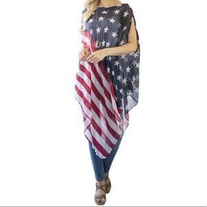 Lightweight Flag Poncho. Perfect to wear over practically anything to show your patriotism. Measures approximately 47” x 47”.