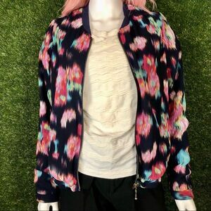 Listing is for a no brand glitchy floral Bomber jacket, featuring a semi-sheer outer fabric, solid navy lining, and an exposed metal zipper. No size tag, would say S-M.