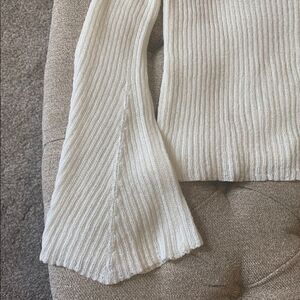 Lightweight Shoulder Tie Sweater. Features bell sleeves and cold shoulders with ties at shoulder.