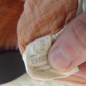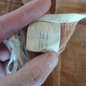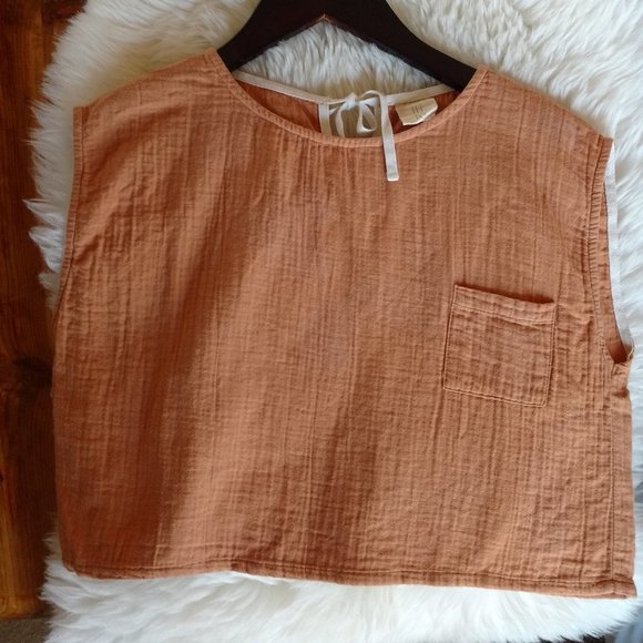 German brand. Soft, double-gauze organic cotton in Terra Cotta. Boxy, cropped style with a sweet tie at back of neck and a little pocket on the front. I got a lot of compliments from other moms when my daughter wore this top. Size says 8/10 year, but it is quite cropped...my 6 year old wore it perfectly, but it's now too short for her (a tall 7) with regular shorts. The boxiness is awesome and would accommodate a variety of sizes/ages.