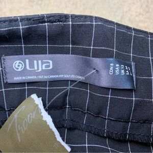 Side zip, 2 snap side pockets, white trim, back pockets. Belt loops