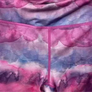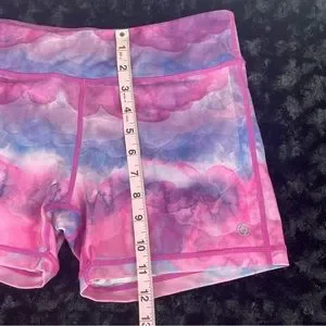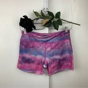 Cotton candy cloud print biker shorts. Purple and pinks. Lija brand. Tennis brand. Drawstring waist. Front pocket. Size Small, measurements in pics. Gently preowned.