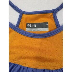 The Lija Tank Top in purple and orange is perfect for active women seeking a comfortable and stylish activewear top. Made from a polyester/elastane blend, this tank features a round neckline, pullover closure, and a racerback strap type. Ideal for activities such as tennis, golf, running, jogging, and cross-training, this tank offers stretch for flexibility and is machine washable for easy care. With a solid color and a theme of colorful sports, this tank is a versatile addition to any summer, fall, or spring wardrobe. Made in Canada by the brand LIJA, this tank is designed for a petite size S/P chest of 36 inches.