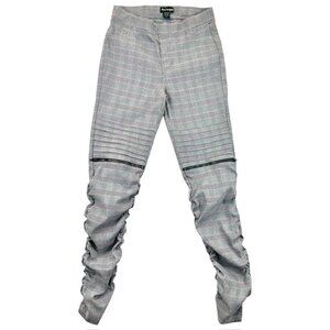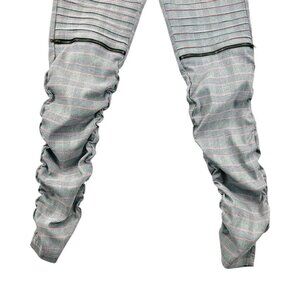 These moto-style skinny pants feature a modern plaid pattern and ruched detailing for a stylish and professional appearance. Crafted with a comfortable polyester blend, these pants are durable and versatile for office or casual settings. Zipper accents add a sleek touch to the design.