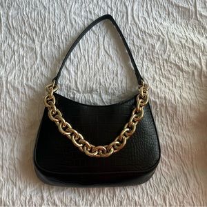 Black purse with gold chain accent. In great condition! zipper pocket on inside. Snap button.