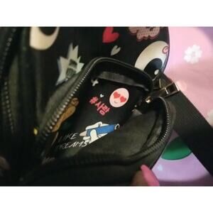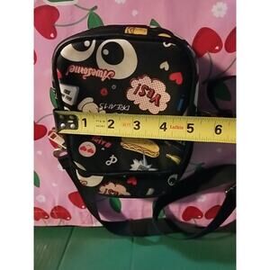 The Like Dreams Crossbody Bag in Black is a stylish and versatile accessory for travel or casual use. This small rectangular bag features a zip closure, black handles/strap, and gold hardware accents. The exterior is made of polyurethane with a polyester lining, and the detachable strap offers added convenience. The bag also includes a key clip and showcases a unique comic print pattern with a dream-themed design, making it a standout piece for any outfit.