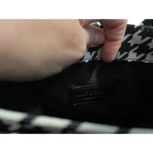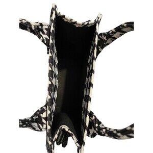 The Like Dreams Houndstooth Two Tone Black & White Handbag Purse is a small top handle bag with a unique houndstooth pattern, featuring a black and white exterior and a silver hardware color. The bag has a width and height of 7.5 inches, with a polyester lining in black color. The brand, Like Dreams, offers a stylish and on-trend accessory for women, perfect for adding a touch of dreamy elegance to any outfit. Made with fabric exterior material and a fabric handle/strap, this handbag purse is a chic and fashionable choice for any occasion.