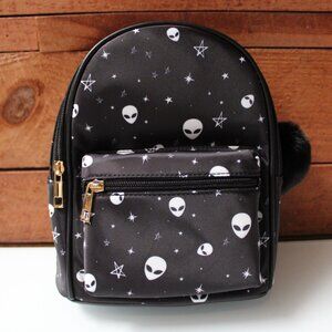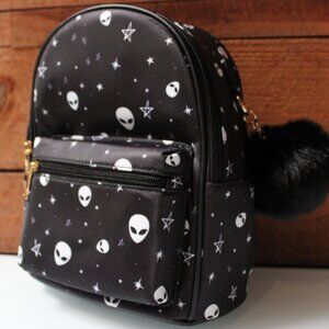 Like Dreams Mini Backpack Black Alien Print Faux Leather Small Bag Pom Keychain