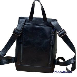Faux leather high quality material with gunmetal studs. Zip closure and adjustable straps.