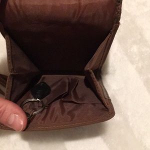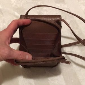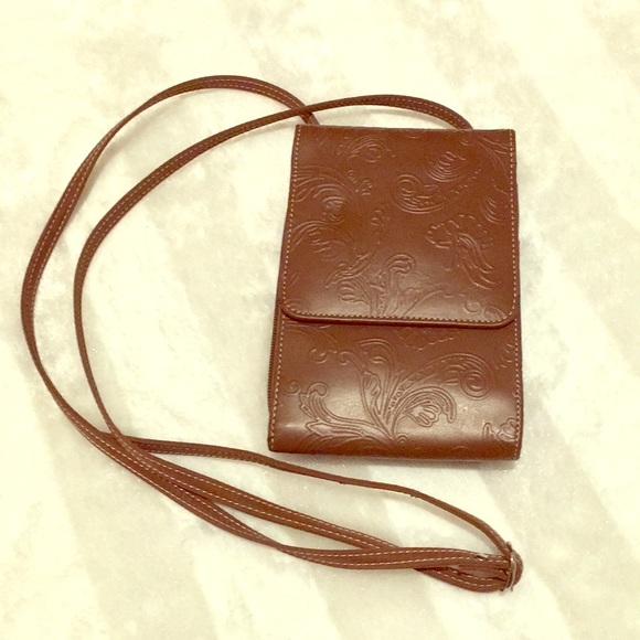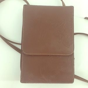 Embossed Brown Leather Crossbody Purse. Mint condition. No brand noted. Front snap portion measures 4 1/2x7. Back zippered portion 5x6.