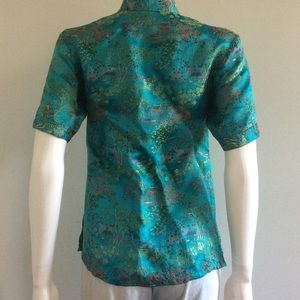 Gorgeous aqua colored, Chinese-style top with five knob ties in the front. Side vents. No size label but fits like a size small.
