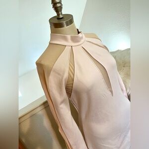 Perfectly like NEW!!! M Free People Monarch elegant, artistic, sophisticated top that is a WOW statement top that everyone will love with guaranteed compliments!! The color is a blush pink and beige cream like color! Very versatile since this is perfect for layering! Features these gorgeous cutouts lined with mesh. The quality on this one is also out of this world brilliant!! Features a slit on the sleeve cuffs and a zipper in the back. This reminds me of an ice skating outfit minus the sequins. Measures 17.5” across the bust, shoulder to hem is 25”. Sleeve length is 21” measuring from the underarm seam and is 4” across the hem. The slit allows for more room and is 5” in length. Back zipper length is 18”. Fabric has ample stretch!! Cardigan sold separately and necklace is NFS.