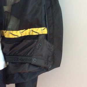 Black waterproof jacket with lots of detail: detachable, adjustable storm hood with brim; zippered hand pockets; inside drawstring pocket; side pit vents to adjust temperature; elastic drawcord hem; zip, snap, and Velcro close; adjustable Velcro cuffs; adjustable, snap-close, elastic powder skirt, driclime lined chin guard, hi-low hem is lower in back. Excellent condition, worn only a few times. ***NOTE: jacket does not include liner vest.