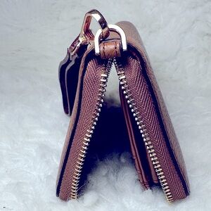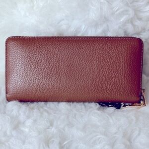 Gorgeous like new Michael Kors pebbled leather saddle brown ZIP around long wallet approximate size 8 x 4” includes an unbranded wristlet & shiny gold hardware. LIKE NEW Elegant tan leather wristlet by Michael Kors. Features a convenient wrist strap and sleek design. Has an interior zip pocket with plenty of room for credit cards and cash!