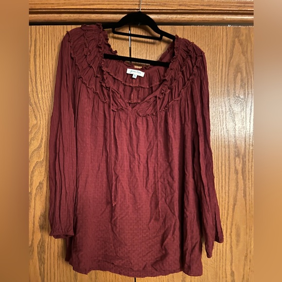 Cute long sleeve top with tie at neck detail. Pretty burgundy color for fall.