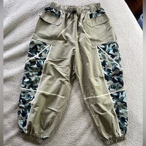 Trendy cargo jogger parachute pants with camouflage side panels. Features elastic waistband and cuffs.