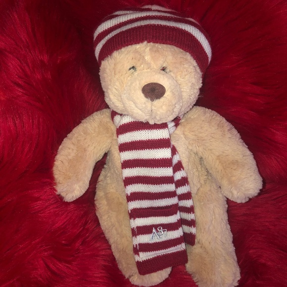 Adorable soft plush bear from Aeropostale with a candy cane stripe beanie and scarf with the Aeropostale logo. This bear is adorable and a great stocking stuffer he is really soft. He measures 14 in long by 13 in wide smoke free Like New grab yours today 😊