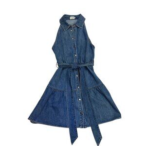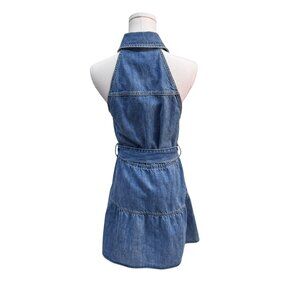 Alice + Olivia Jeans Miranda sleeveless mini denim dress in Albee Vintage Blue wash. Features a collared halter neckline, button-down front, removable tie belt at the waist, and tiered mini skirt for a flattering silhouette. Perfect for casual outings, festivals, or layering year-round.