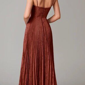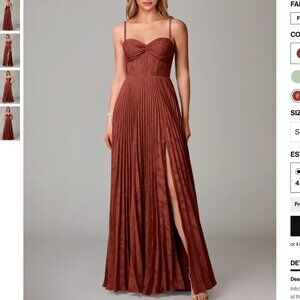 This is the Azazie Akiko Terracotta A-Line Sweetheart Neckline Floral Burnout Dress currently on sale for $129 on their website. Worn once for a wedding and washed. Beautiful, well-fitted dress true to size for a petite girl. I'm 5'3" and had it hemmed to wear 3 inch heels. $115 OBO (the hem was $100 itself because the pleated skirt is a lot of material). Great gown for a fall wedding!