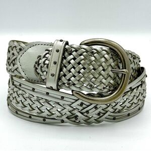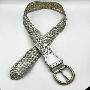 Beautiful woven/braided belt. Looks unused. Color is more of a platinum or a champagne gold. 80% Bonded leather and a metal buckle. Belt strap is 1.75” wide and 41” long. Either excellent preowned condition or unused, it’s in fabulous shape!