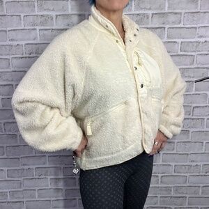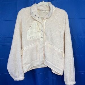 Excellent, perfect, condition. Like new. Adorable fuzzy little fleece sweater/sweatshirt. Snaps up the front. Bat wing sleeves. Three zipper pockets. Size Medium. The chest measures 26 inches across pit to pit.