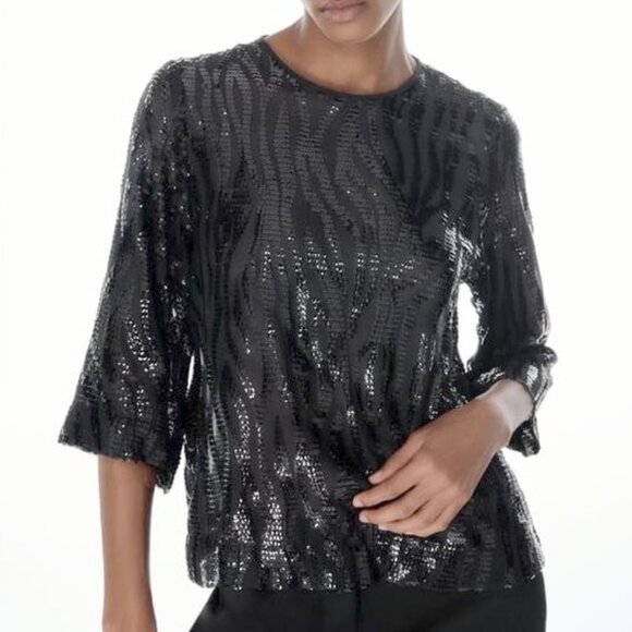 Shine bright with this elegant black sequin top. Perfect for any special occasion, this top adds a touch of glamour to your wardrobe.