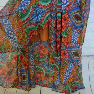 Multi- Colored Floor Length Dress with waist tie and front slit. V- Shaped color with inverted v slit for a slimming look. Fits true to size.