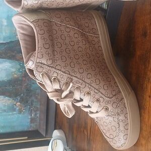 Like New! Guess Women's Tan And Brown Logo G Hightop Lace Up Wedge Sneakers 8.5