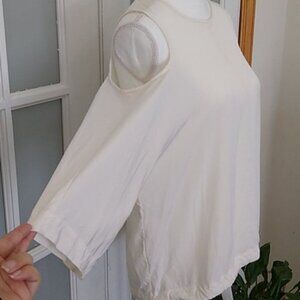 Tibi Silk Cold Shoulder Ivory top with tie at waist, keyhole back with button closure and 3/4 sleeves.