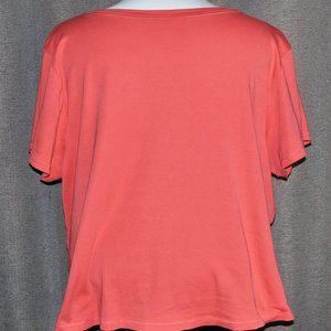 Very gently worn, great condition. A beautiful coral color, soft and flowy. 100% Pima Cotton. 4X - APPROX. Measurements: 27" armpit to armpit laying flat, 27" from shoulder to front hem.