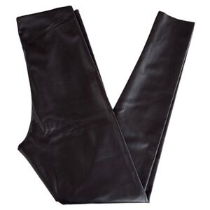 Like new; Black polyester/spandex faux leather; pull-on style (no zip/buttons); raw edge hem; 28.5” inseam; 11” rise; laying flat waist measures approx. 13“ across and stretches to approx. 17”; smoke free home. b