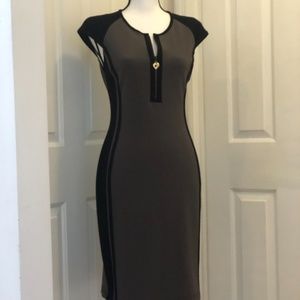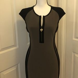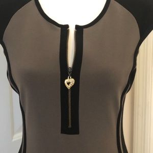 Like New!Joseph Ribkoff Slenderizing Dress. Chocolate Brown with Black Stirpes down the side. Gold Heart Pendant on Zipper.