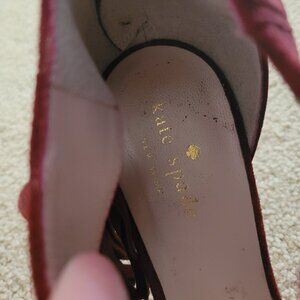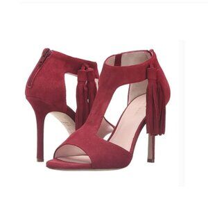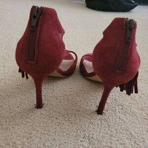 Beautiful like new Kate Spade Inga Red Suede Fringe Tassel Stiletto Heels. Made in Italy. Genuine suede upper. T-strap style, embellished with 2 fringe tassels on outer sides. Open toes, closed back with zipper, as shown in photos. 4" stiletto heel. Lightly padded footbed. Wore once to a musical for maybe 4 hours total. In excellent condition. Size 9 B. Reasonable offers welcome.