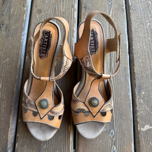 In Excellent, Like New Condition! L'Artiste Nicolasa Comfort High Wedge Sandal in Women's 40/US 9 - L'Artiste creates artistic masterpieces that you can wear like these comfort wedge Nicolasa open toe t-strap sandals. Are they more aesthetically beautiful to the eyes or more super comfortable for your feet - you can decide.