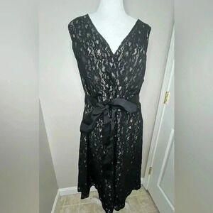 Black lace overlay, beige lining. Faux wrap V-neck. Sleeveless. Removable black ribbon self-tie belt. Hidden zipper closure on side. Approximately 40” from shoulder. Machine wash.