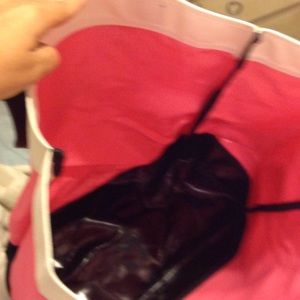 Like New Very large VS tote. Has vinyl lining inside, so it would be perfect for the beach or pool. Hot pink, w/ black bottom, and white on top. Will hold several beach towels. Has small mark on outside, came that way. Is discounted because of that.