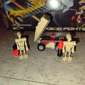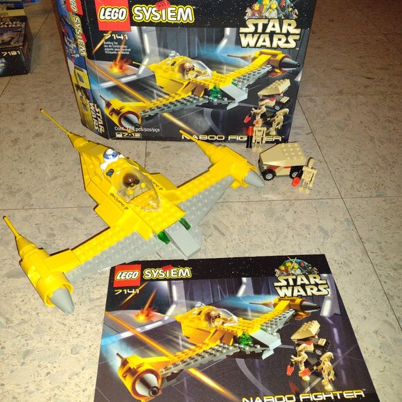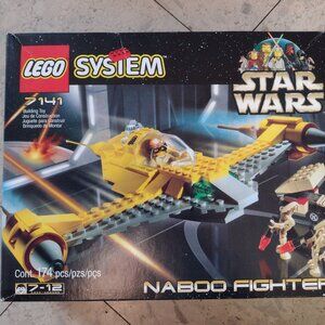 A great fighter plane with its pilot and R2D2 in the second seat. The plane is large and can be configured in different ways. There are also two droids with a little car which opens up. All the pieces are like new and included as well as the original box and the instruction manual. This set was put together and has been sitting on a shelf in a closet. This is a really fantastic set for any child. This set is one of seven Lego Star Wars sets in our closet. Relive the epic battles of Star Wars with the Naboo Fighter! Released in 1999, this vintage set features a sleek and iconic Naboo starfighter with intricate details and movable parts. The set includes four minifigures, each with its own unique accessories. With 183 pieces to build and 32 description pages to guide you, this nostalgic set is perfect for both seasoned collectors and new fans of the beloved franchise. Display it proudly or recreate memorable scenes from the prequel trilogy - the possibilities are endless!