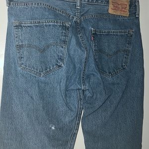 Like new, Levi’s 501, button fly, straight leg jeans. My husband wore them a couple of times and go a snag in the back under the left hand pocket. It is small and shown in last picture. Otherwise they are in excellent condition.