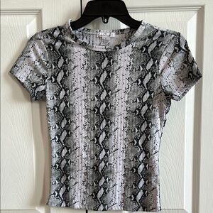 Stylish snakeskin print top with short sleeves. Features a black/white/gray pattern.