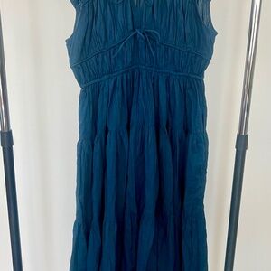 This dress looks like it could be from an expensive boutique. A pretty dark blue with a tiered skirt and trendy ties across the chest, this dress is perfect for the summer, but has enough fabric to hold up to cooler temps.