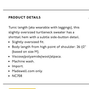 Like New! Madewell Crestland Side-Button Turtleneck Tunic Sweater