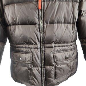 Beautiful medium shine dark brown jacket little of pockets and fashion with a cozy design. Ideal for blustery winter days. There's a detachable fur edged hood.