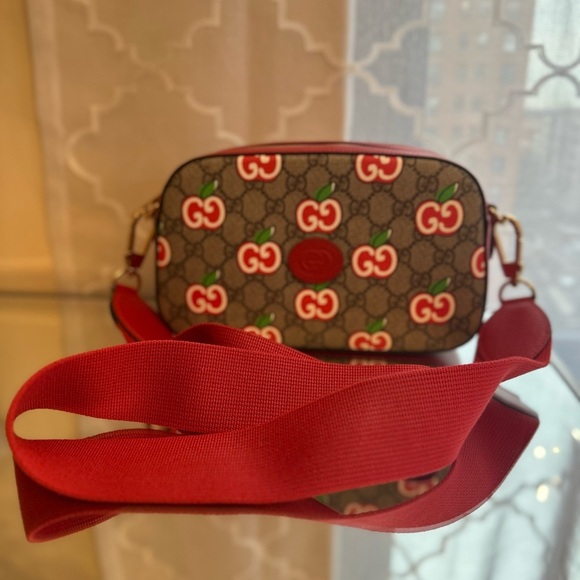 This gorgeous Marmont Supreme Canvas Camera Bag is a must-have for any fashionista. Crafted with a unique apple print, this eye-catching crossbody combines style and practicality. The bag features the signature GG Marmont design, with a durable canvas exterior, and is finished with a red guitar strap for a chic, elevated look. Perfect for everyday use or special occasions, this bag offers a convenient size with ample space to carry your essentials in style.